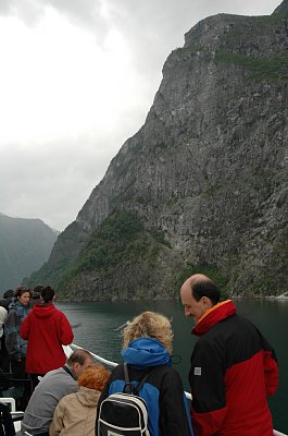 後半から船は、ナローフィヨルドと呼ばれるもっとも狭いフィヨルドの間を通っていく。両側の山々というか岩々を見上げていると、首が痛くなりそうだった。