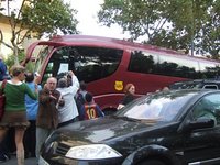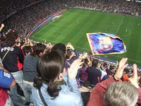 17時すぎに着くと、すでにファンがサッカー場カンプノウ[Canpnou]を取り囲んでいます。19時が試合開始なのに、みんな来るのが早い! ちょうど選手のバスが移動するところで、バルセロナのユニフォームを着たファンが茶色のバスを包囲!カメラのフラッシュが飛び交っています。