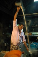 ガンジス河のそばでは、夜にプージャー(礼拝)が行われています。太鼓などの音とともに演じられるまるで炎のショー。熱そう・・・ なんて感じつつも、礼拝と聞いて、じっと見守っていました。24時間、賑やかなガンジス河です。
