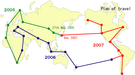 | 2005 | 27th May 2005,start of SEKATABI from KANSAI airport in Japan. May to June China(only Beijing),Mongolia,Russia July to September Estonia,Finland,Norway,Sweden,Denmark,Germany(north),Netherlands,Belgium,France(only Calais),United Kingdom October to Movember France(west),Spain(west),Portugal,Spain(south,east),France(south),Monaco 7th November 2005 It was a terrible thing that our valuables were stolen by someone from our car. So, we had to go back to Japan for about 3 months. |
