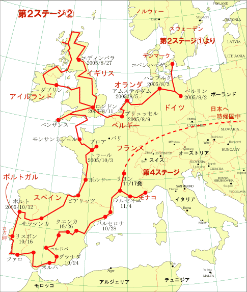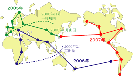修正後の計画は、通算1年半の世界一周に変更しており、2007年2月帰国予定?です。(2006年2月更新)